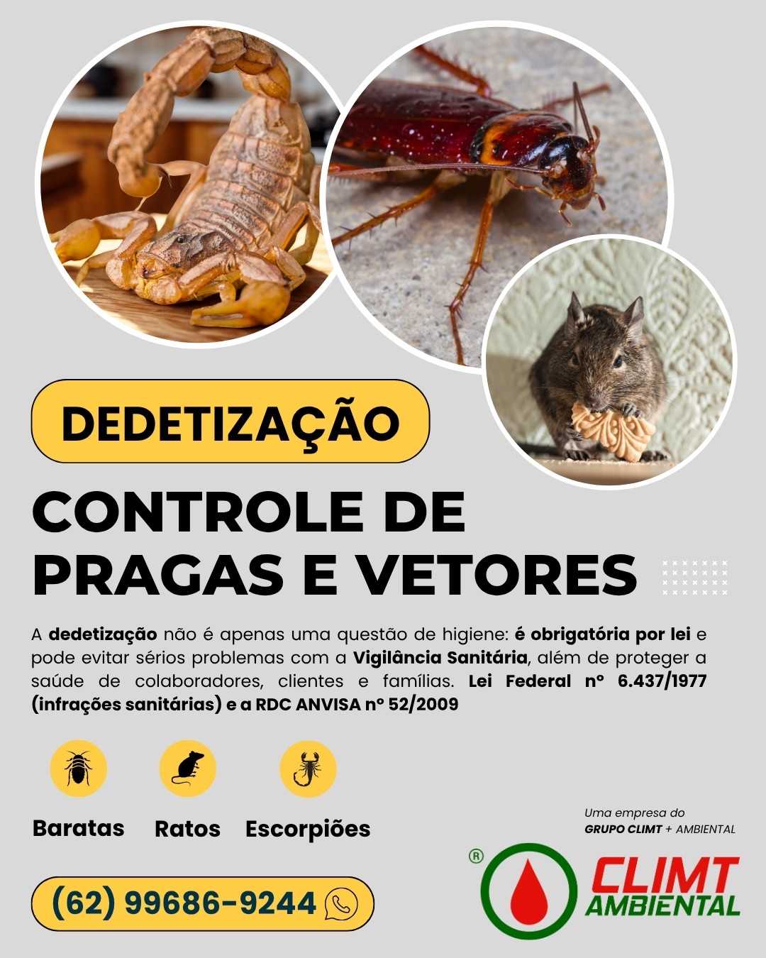 Dedetização em Goiânia (Controle de Baratas, Formigas e Mosquitos) | CLIMT AMBIENTAL Dedetização em Goiânia A dedetização em Goiânia é um serviço essencial para empresas, indústrias, clínicas, hospitais, escolas, comércios e condomínios que precisam manter ambientes livres de pragas urbanas. A CLIMT AMBIENTAL é especialista em dedetização em Goiânia, atuando com técnicas modernas de controle de baratas, formigas e mosquitos, utilizando produtos regulamentados pela ANVISA e aplicados por equipe técnica qualificada. O objetivo da dedetização em Goiânia é prevenir surtos, eliminar focos de infestação e garantir ambientes saudáveis e seguros para colaboradores, clientes e visitantes. Mais do que um procedimento de higiene, a dedetização em Goiânia é uma exigência legal da Vigilância Sanitária.