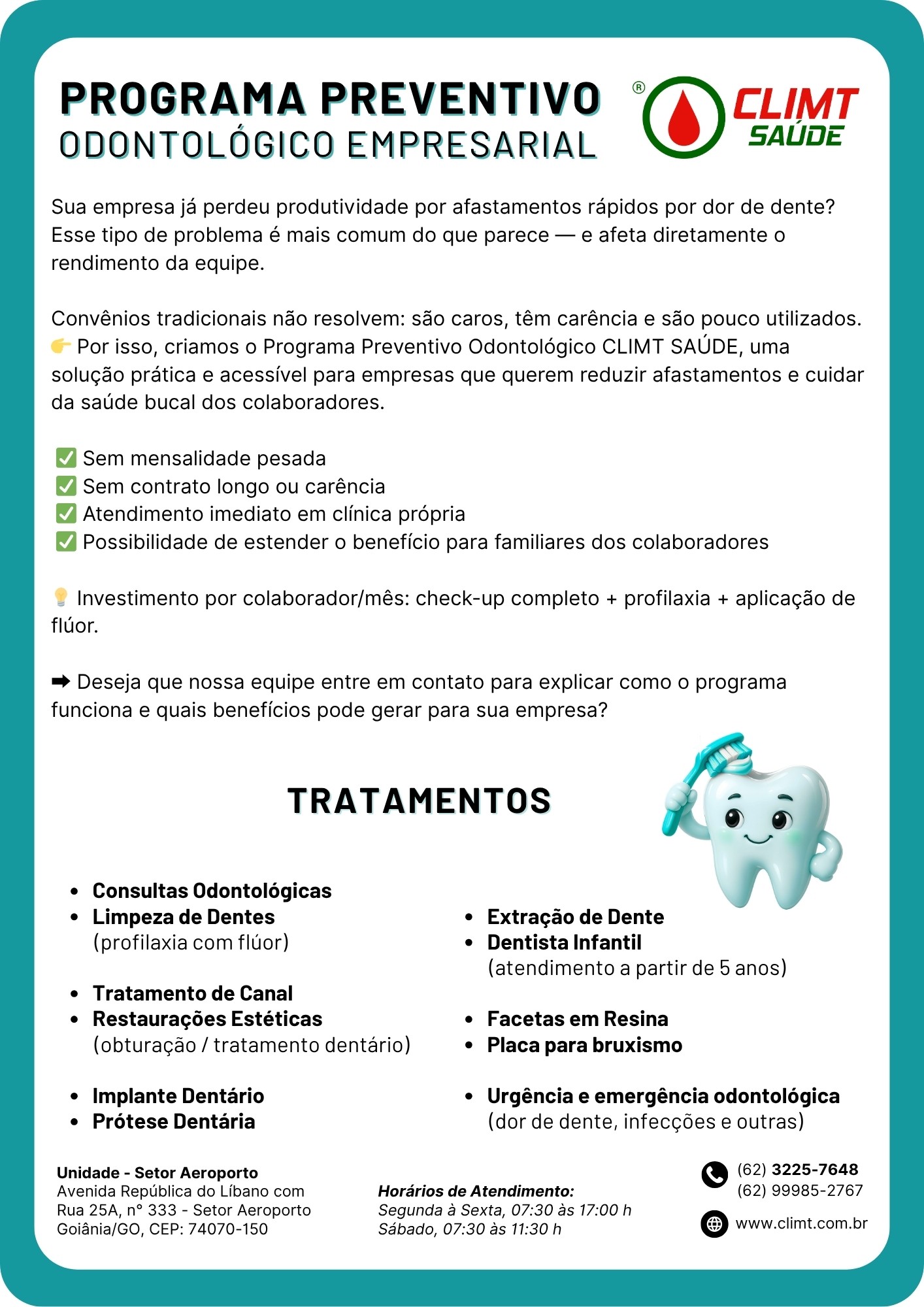 Programa Preventivo Odontológico Empresarial em Goiânia | CLIMT SAÚDE Programa Preventivo Odontológico Empresarial em Goiânia O Programa Preventivo Odontológico Empresarial em Goiânia foi criado pela CLIMT SAÚDE com um propósito claro: reduzir afastamentos por problemas odontológicos e promover saúde bucal com custo acessível para empresas e colaboradores. A CLIMT SAÚDE é referência em Programa Preventivo Odontológico Empresarial em Goiânia, oferecendo uma solução prática, sem mensalidades pesadas e sem carência, que substitui os convênios tradicionais — caros, burocráticos e pouco utilizados. Empresas que adotam o Programa Preventivo Odontológico Empresarial em Goiânia percebem redução imediata nas faltas, melhoria no desempenho da equipe e valorização do clima organizacional, além de demonstrar cuidado genuíno com o bem-estar de seus colaboradores.